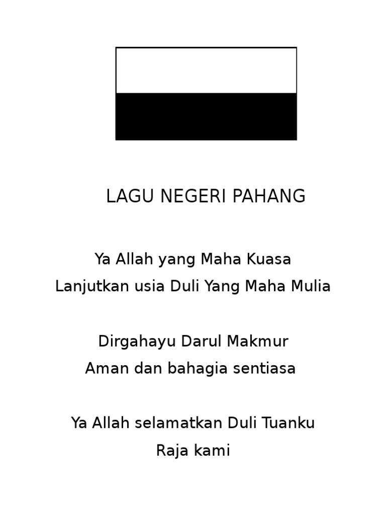 Lirik Lagu Negeri Pahang Ya Allah yang Maha Kuasa Lanjutkan usia Duli Yang Maha Mulia Dirgahayu Darul Makmur Aman dan bahagia sentiasa abadi Ya Allah selamatkan kebawah.